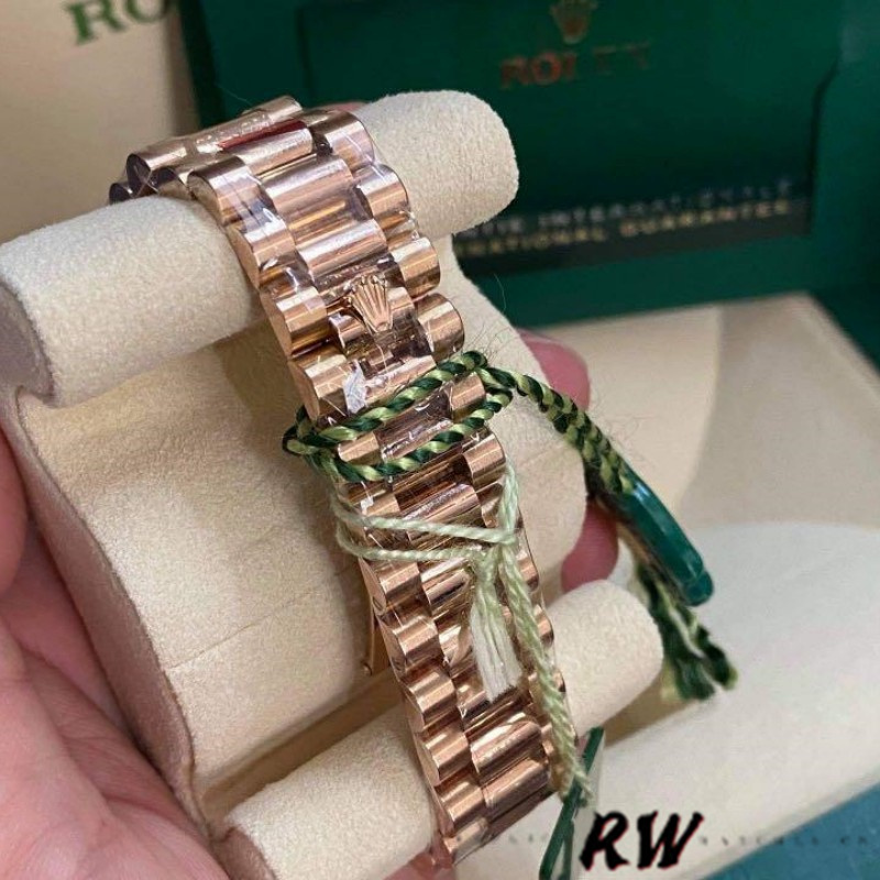 Rolex Day-Date 118235 Everose Gold Pink Jubilee dial 36mm Lady Replica Watch.36mm rose gold oyster case in diameter.Fixed - fluted everose gold bezel. Pink Jubilee dial with rose-gold tone hands and diamonds an hour markers.Date display at 3 o'clock; day display at 12 o'clock.Scratch resistant sapphire crystal. Screw down crown. Solid case back. Rose gold oyster bracelet with hidden clasp.