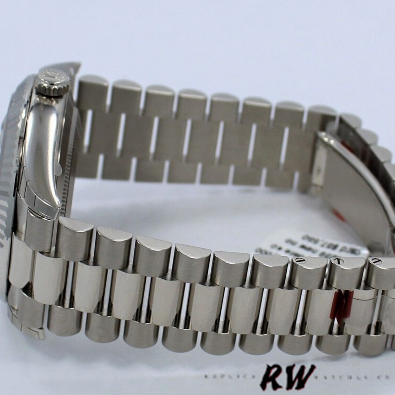 Rolex Day-Date 228239 Green Roman Dial Fluted Bezel 40mm Mens Replica Watch, featuring a 40mm White Gold case, solid case back with screw-down crown and fluted bezel. Scratch-resistant sapphire crystal with Cyclops magnifying glass.Green Dial Roman Numeral Hour Markers, date window at 3 o'clock, day of the week window at 12 o'clock,White Gold three-piece presidential bracelet with deployant clasp.