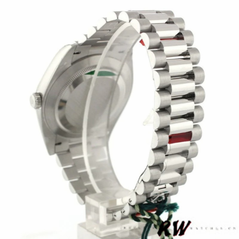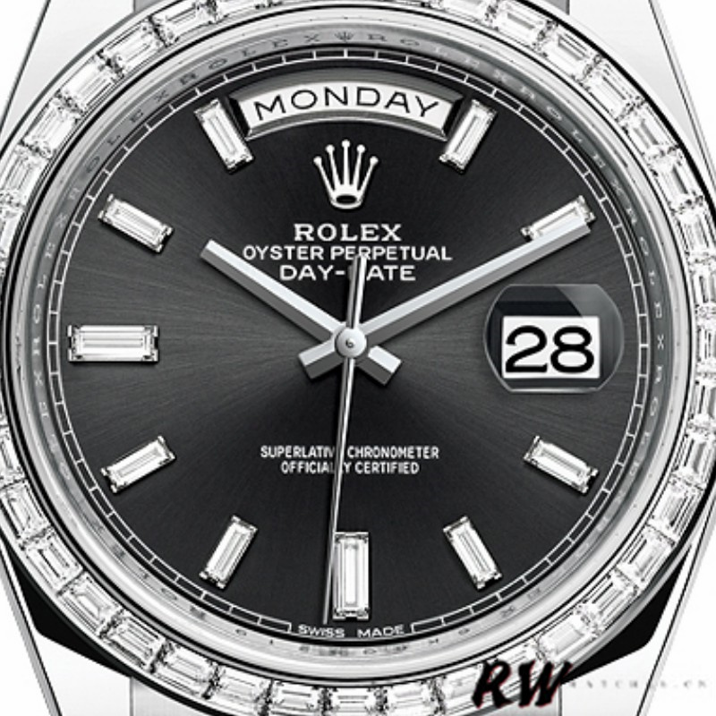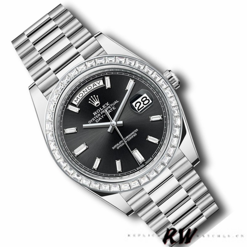 Rolex Day-Date 228396TBR Black Dial Diamond Bezel 40mm Mens Replica Watch, featuring a 40mm platinum case, solid case back with screw-down crown and Diamond Bezel. Scratch-resistant sapphire crystal with Cyclops magnifying glass.Black Dial with Index Hour Markers, date window at 3 o'clock, day of the week window at 12 o'clock,Polished platinum President bracelet with Concealed folding Crownclasp deployment buckle.