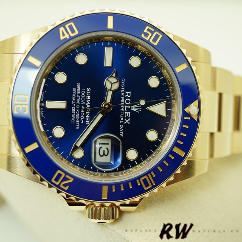 Rolex Submariner 126618LB Yellow Gold Blue Dial 41mm Mens Replica Watch,41 mm yellow gold case, screw-down crown with triplock triple waterproofness system, unidirectional rotatable bezel with blue Cerachrom insert and gold coated numerals and graduations, scratch-resistant sapphire crystal with cyclops lens over the date, blue dial, Yellow gold Oyster bracelet with flat three-piece links, folding Oysterlock buckle with glidelock extension system.