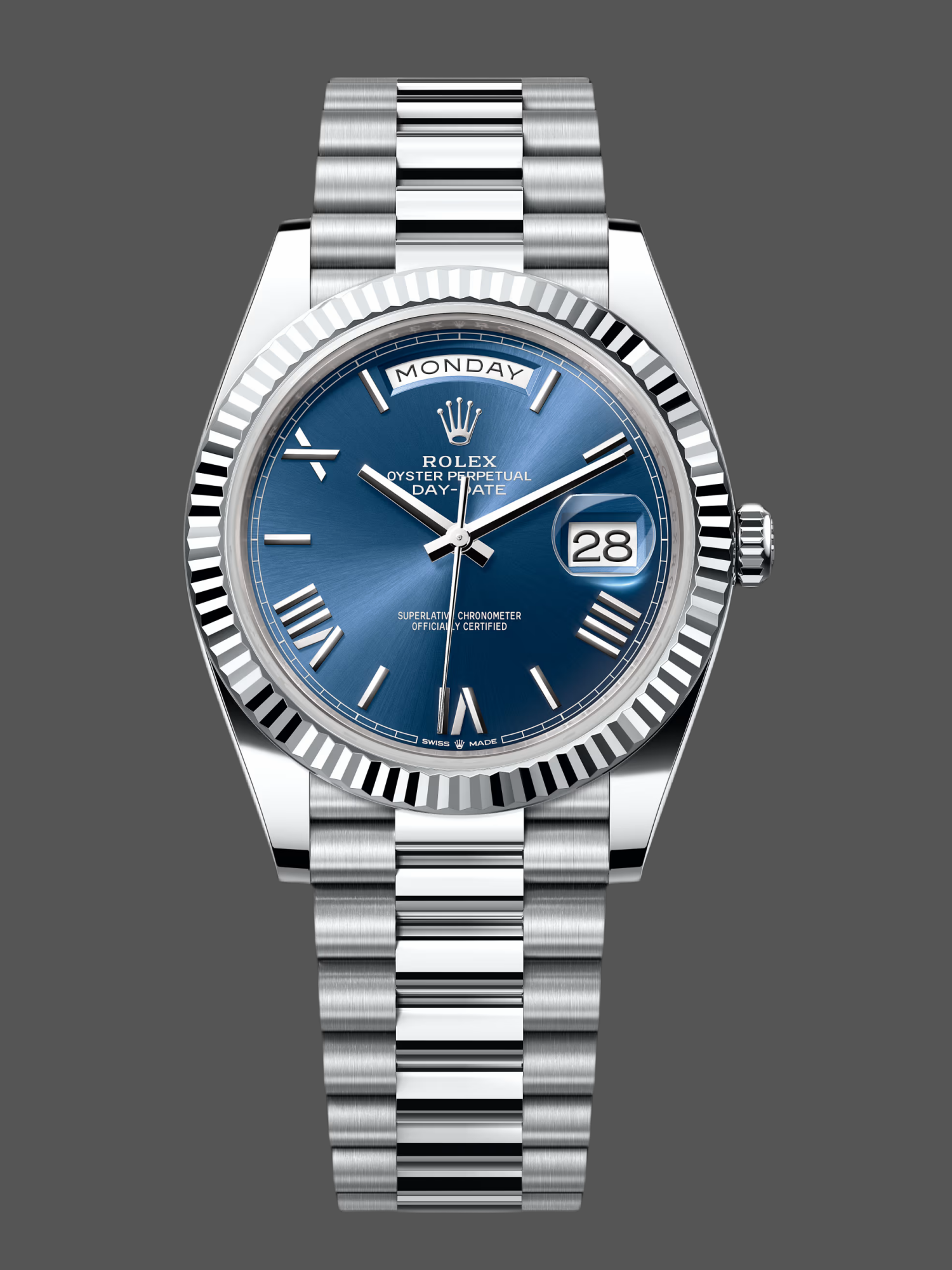 Rolex Day-Date 228239 Blue Roman Dial Fluted Bezel 40mm Mens Replica Watch