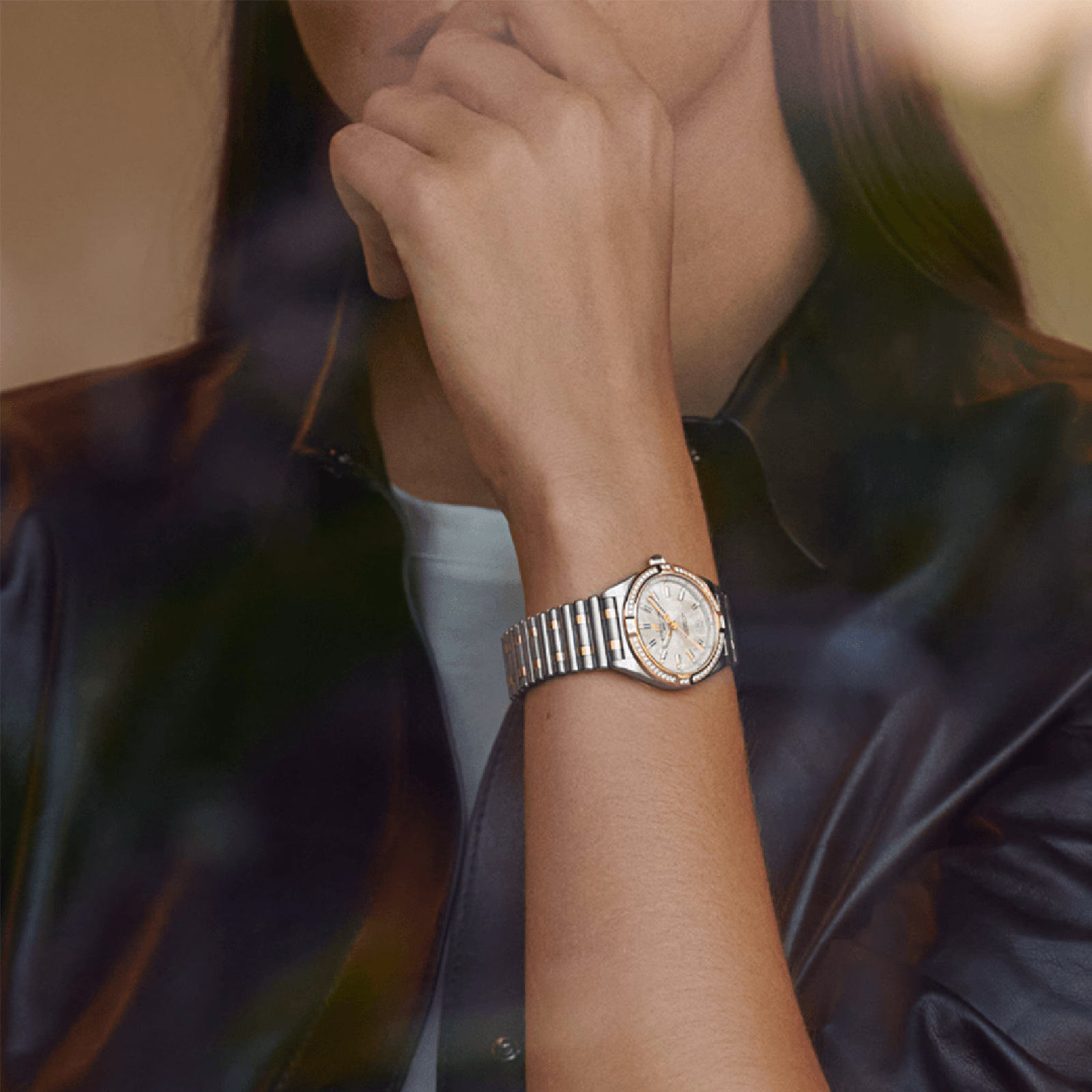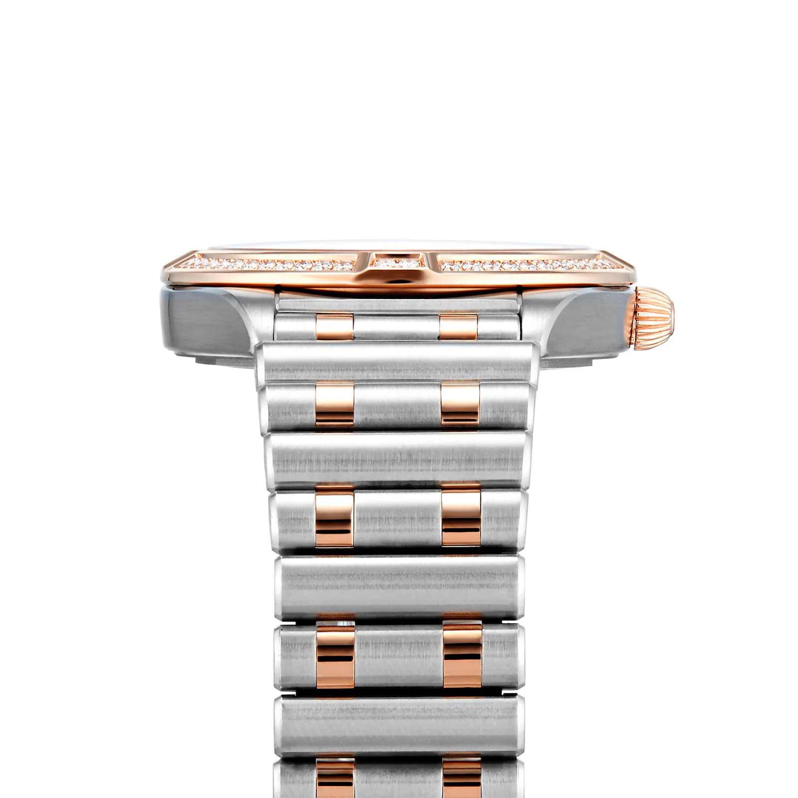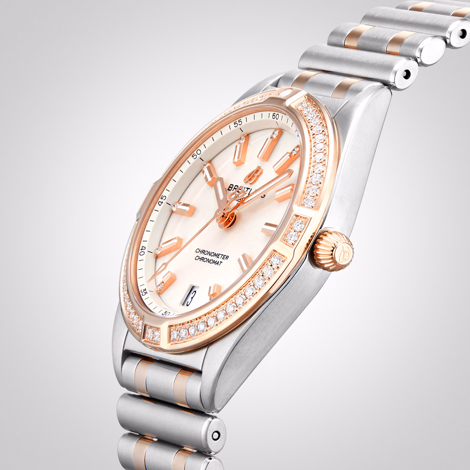 A diamond set bezel is mounted to a 32mm 18k red gold and stainless steel case presented on a two-tone bracelet.