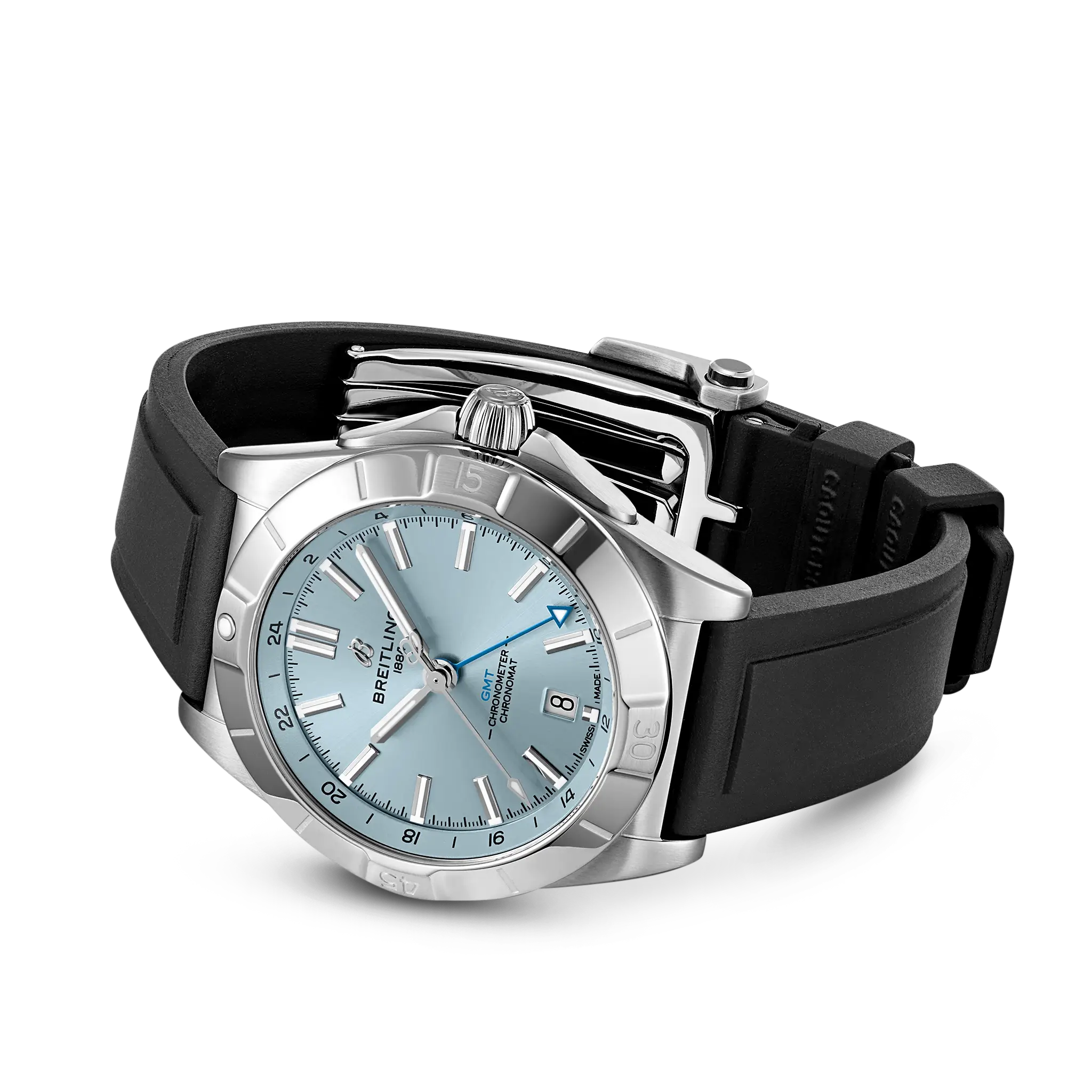 Experience the timeless elegance and precision of the Breitling Chronomat Automatic GMT 40 watch. This exquisite timepiece features a stunning ice blue dial with index hour markers, a convenient date function, and a GMT second time zone for easy travel. The 40mm stainless steel case is complemented by a luxurious platinum bezel, while the black rubber strap with a deployment buckle ensures a comfortable fit. Equipped with automatic movement and certified as a chronometer, this Breitling watch is a perfect blend of style and functionality. Ideal for those who appreciate luxury and quality in every detail.