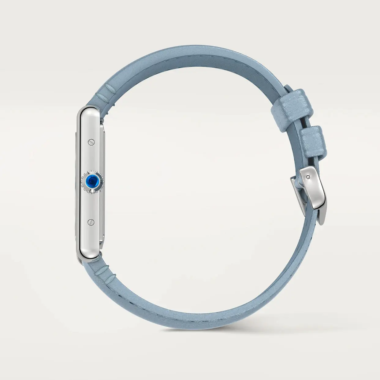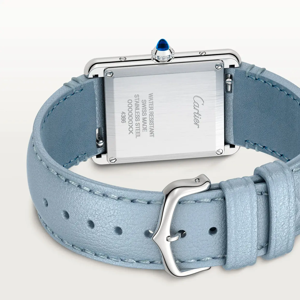 Tank Must watch, large model, photovoltaic SolarBeat movement. Steel case, beaded crown set with a synthetic cabochon-shaped spinel, silvered dial, blued-steel sword-shaped hands, blue strap (made without animal materials), steel ardillon buckle. Case dimensions: 33.7 mm x 25.5 mm, thickness: 6.6 mm. Water-resistant to 3 bar (approx. 30 metres).