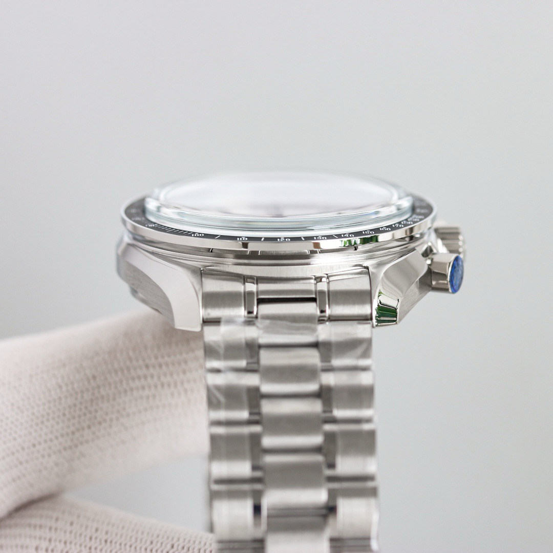 This OMEGA Moonwatch has a white lacquered step dial with blackened hands and hour indexes. Sapphire crystal glass and water resistant up to 50m. Power reserve up to 50 hours. Manual-wind OMEGA 3861 movement. Stainless steel 42mm case and black bezel all on a matching stainless steel bracelet.